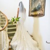 Added boning in corset for fit. Lowered the back. Added original lace trim to create modesty after back lowering. Bustle ribbons added. Dress has been hemmed 1/2 inch from original length. Dress has been professionalally cleaned. Veil included if wanted (retail value $350)