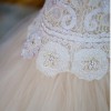 The top portion of the dress is ivory beaded and embroidered. The bodice is sheer with a champagne underlay. The beautiful tulle skirt is made with a horsehair hem- slight train in the back.