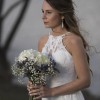 Ivory English Net and lace A-line bridal gown with a sheer halter neckline, braided straps, and pom trim bodice accents.