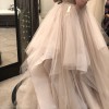 60" length (size 10) Hidden back-zip closure Surplice V-neck bodice Sleeveless Fitted waist Trailing layered skirt Low scooped back Partially lined 100% polyester tulle