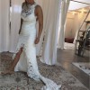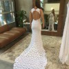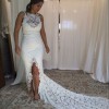 The Alexandra gown is all about the beautifully balanced silhouette, which highlights the female shape in an elegant and subtle way. Handmade from soft, stretch French lace and hand cut lace motifs appliqúed on every edge. Beginning with a flattering high neck with a plunging V-neck lining and built in size ‘B-C’ cups, the Alexandra has a daringly low, yet wearable open back, which is secured with a single satin button at the neckline. The dramatic fishtail skirt, which has a centre front opening and large back godet, with a stunning 80cm train. A concealed finger loop is featured on the 80cm train. The 80cm train length also provides a bustle to keep you moving and dancing all night.