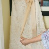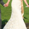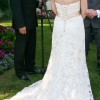 One-piece, strapless, slim A-line gown with corset back. Lace adorned with sparkling sequins and beading. Sweetheart neck line with gold satin ribbon.