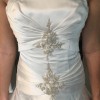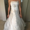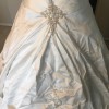Worn once. Has been dry cleaned and stored in a box, which is why it’s wrinkled. May need a small clasp added above the zipper. Beaded accents. Has lots of tulle under the gown. Paid $600 on sale.