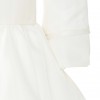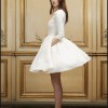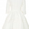 This silk organza Delphine Manivet dress features a high round neck, three-quarter-length sleeves with tonal ribbon trim at the cuffs, an A-line waist and a full skirt with tonal ribbon trim. Was purchased and made-to-order but never worn and still has tags on it and original packaging it was in when it was purchased. Includes crinolin for under skirt.