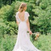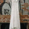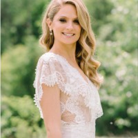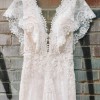 From Galia's website: "French lace sheath dress with a deep plunging v-neckline, an open back, capelet ruffle sleeves and a sheer feature in the front."